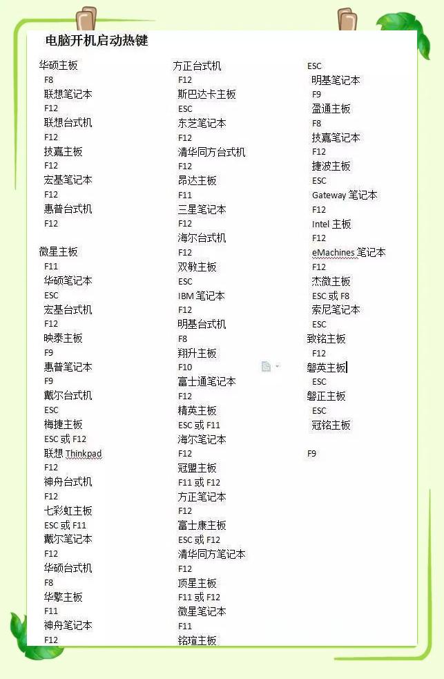 以下是各大主板U盘热启动键的总结,基于权威性和时效性较高的搜索结果整理而成:1. 常见主板品牌的热启动键 联想: F12惠普: F9戴尔: F12华硕: ESC(笔记本)或 F8(台式机)宏基: F12微星: F11技嘉: F12方正: F12清华同方: F12苹果: ALT(或 Option)2. 特定主板的...