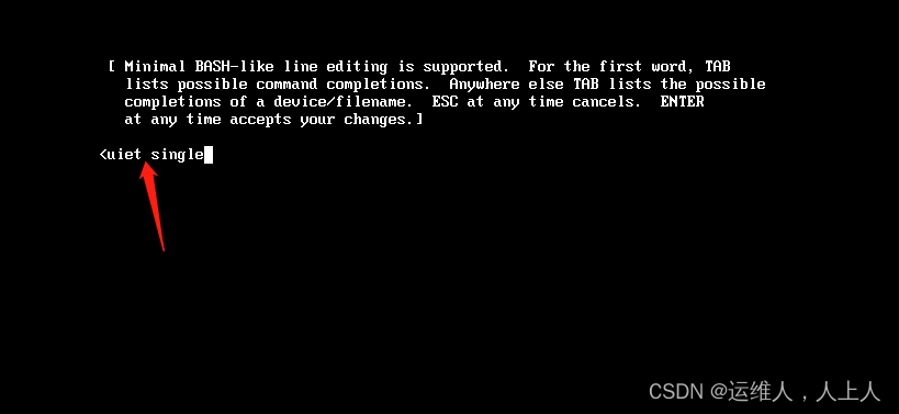 2.在GRUB启动菜单里使用a按键编辑kemnel,在末行输入single,回车进入单用户模式