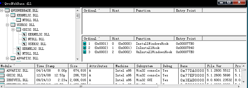 下面是QvodWebBase.dll导出的函数。可以看到有InstallWindowsHook钩子函数。