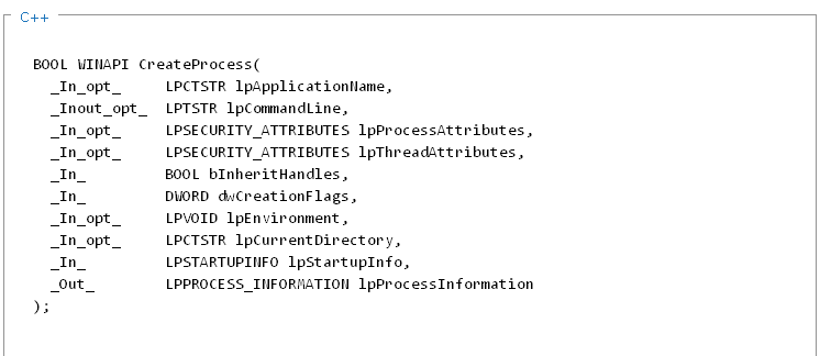 Windows下常见的创建进程的api就是CreateProcess,这个函数申明如下。
