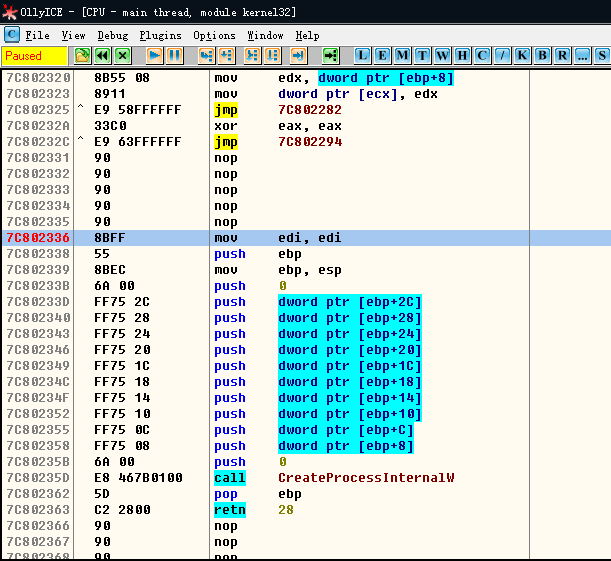 但是重新加载explorer.exe运行,然后查看kernel32.dll的CreateProcess的代码发现了重要的问题。
