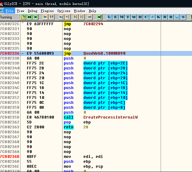 下图就是kernel32.dll中的CreateProcess代码,尼玛不是说好了的CreateProcess将调用CreateProcessInternalW吗?这儿怎么上来直接 jmp QvodWebB.10008B90?QvodWebB你要闹啥啊!!!