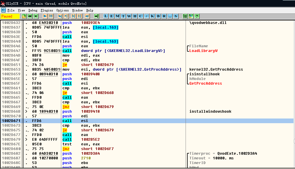 反汇编QvodExtend.dll代码可以发现,注册QvodWebBase.dll中的钩子函数的代码